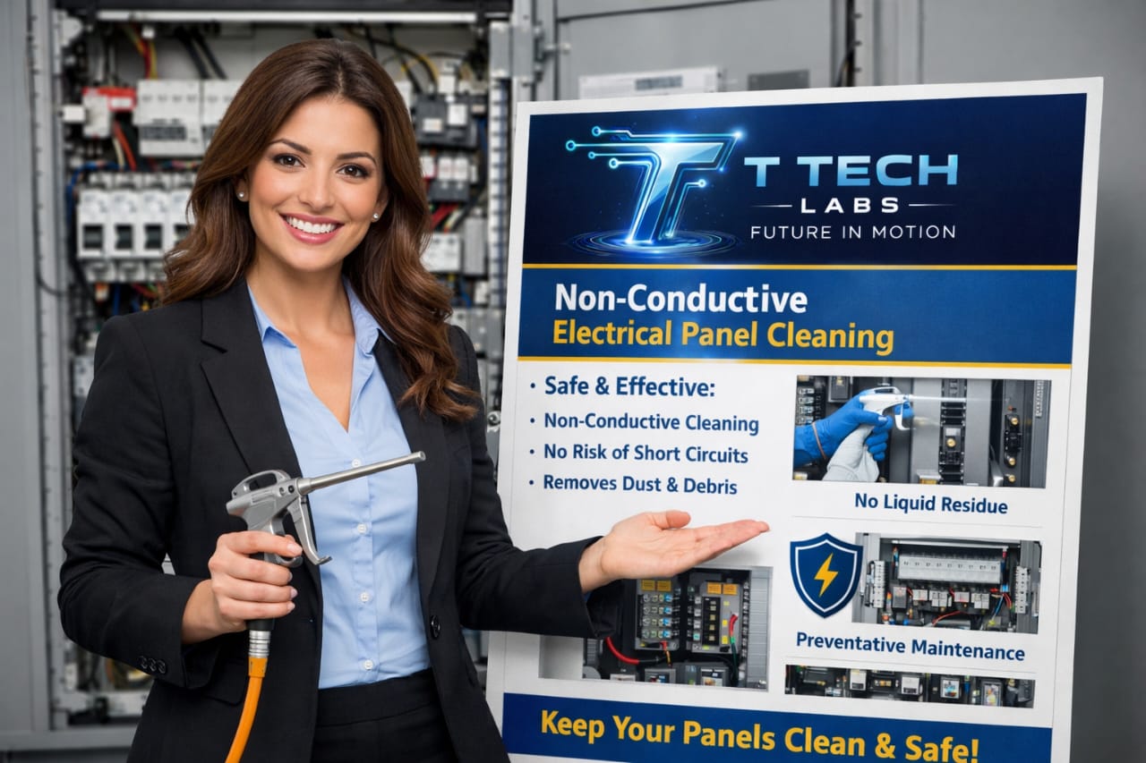 Non-Conductive Electrical Panel Cleaning is a safe and effective maintenance process designed to remove dust, contaminants, and pollutants from live electrical panels without shutting down power. Using non-conductive methods and compressed air, this cleaning improves reliability, safety, and equipment life.